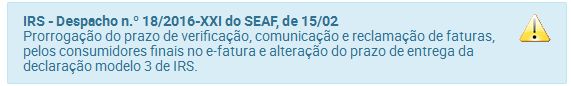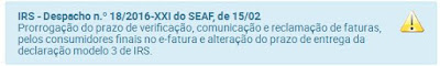 Despacho n.º 18/2016-XXI do SEAF, de 15/02 Prorroga prazo de validação (verificação, registo, reclamação..) pelos consumidores finais O mesmo despacho também define novo prazo para entrega do modelo 3