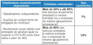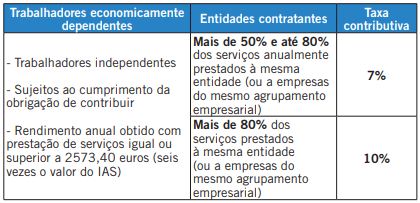 "Os trabalhadores independentes, sujeitos ao cumprimento da obrigação de contribuir podem ser considerados como economicamente dependentes se tiverem um rendimento anual obtido com prestação de serviços igual ou superior a 2573,40 euros (seis vezes o valor do IAS) e tenham prestado, nesse ano anterior, mais de 50% dos seus serviços à mesma entidade."